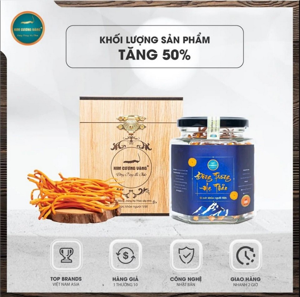 Sản phẩm Đông Trùng Hạ Thảo Thượng Phẩm Kim Cương Vàng hộp 15g với khối lượng tăng thêm 50%. Sử dụng nhiều hơn, tiết kiệm hơn và nhận được nhiều ưu đãi hơn